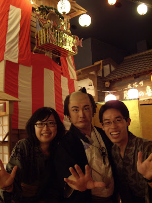 大江戸裡面外國人比日本人多吧。進場因為我們是晚上進場,大概2500左右,要先換上浴衣,他的浴衣很滑,裡面的大場子以江戶時代做背景,很多商店、餐飲等等。還有個表演台,有穿以前衣服的藝人上去表演。